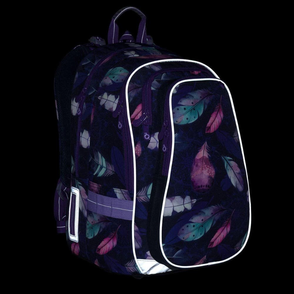 Zadní komora batohu je ideální na přenášení nejtěžších učebnic nebo desek na sešity. Do přední komory jsme přidali praktickou síťovou kapsičku na zip, třeba na doklady. Hluboká kapsa mezi přední komorou a kapsou na čele batohu má užší vstup, proto se skvěle hodí pro penál ve stejném designu nebo krabičku na svačinky.