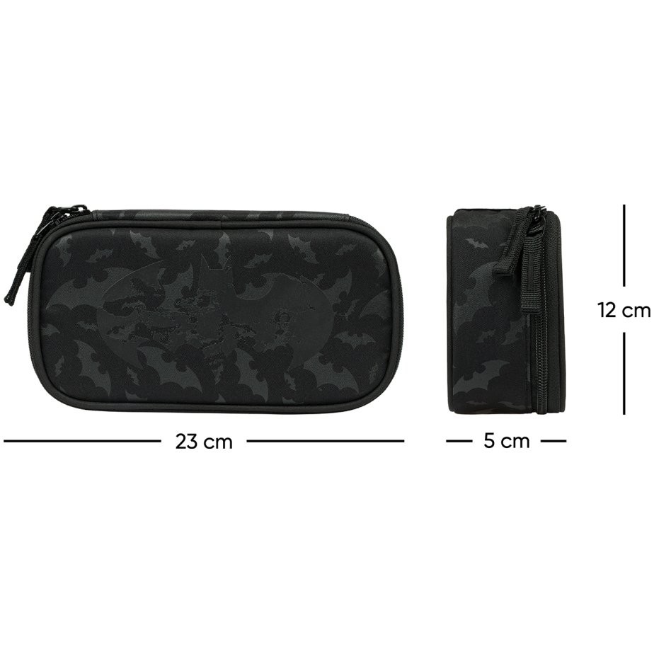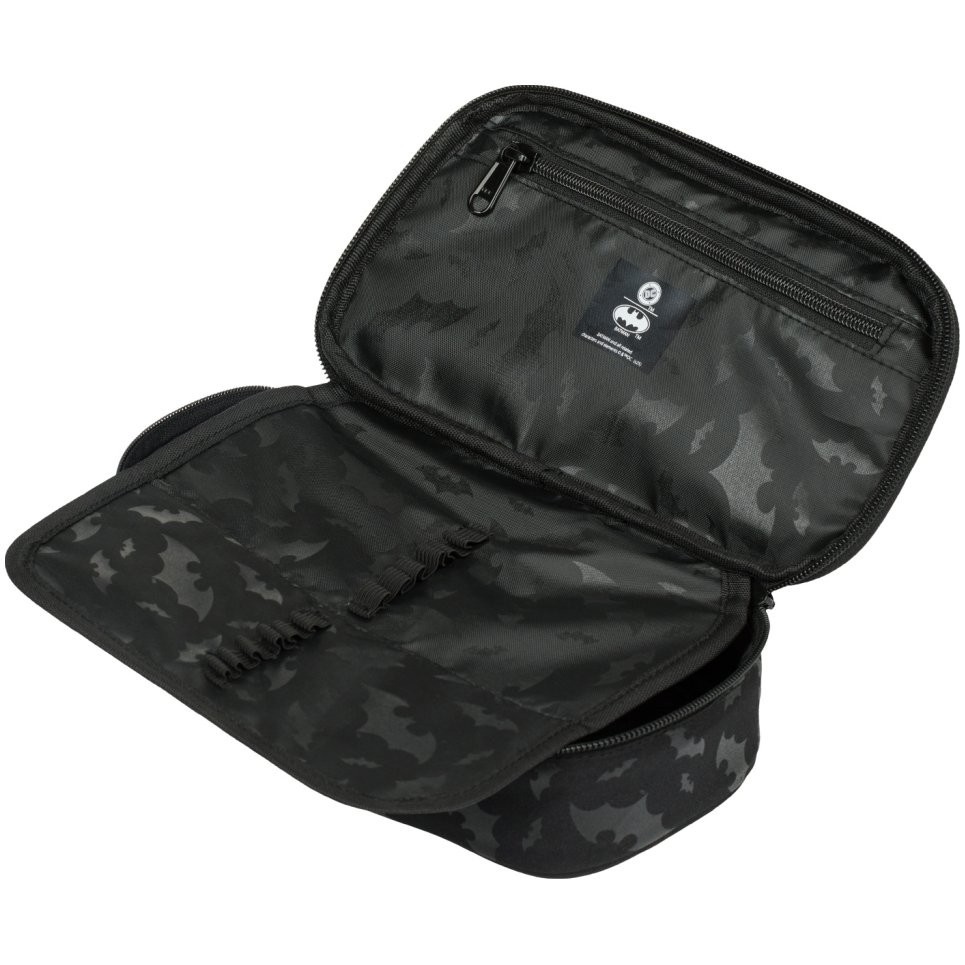 Kompaktní studentský penál na zip Batman s prostornou hlavní komorou a dvojitou výklopnou chlopní nabízí dostatek prostoru pro psací potřeby i drobnosti.