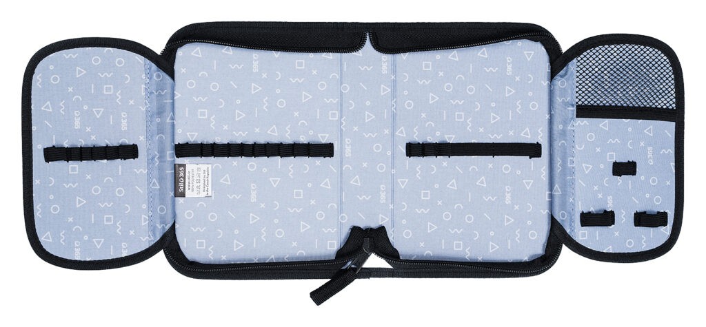 Praktický penál do školy značky Stil Sci-fi má velkou kapacitu k umístění psacích potřeb. Přesně 24 pevných gumiček různých velikostí slouží k pohodlnému uložení pastelek, psacího pera, tužek, pravítka, ořezávátka a gumy. Nově jsme zvětšili výšku hřbetu penálu, díky čemuž pojme ještě více psacích a jiných potřeb. Klopy mají na vnější straně průhlednou kapsičku na rozvrh či jiné malé dokumenty, na vnitřní straně je pak nová síťovaná kapsička pro uložení drobností. Dokonale barevně sladěný design s aktovkou či batohem je samozřejmostí.