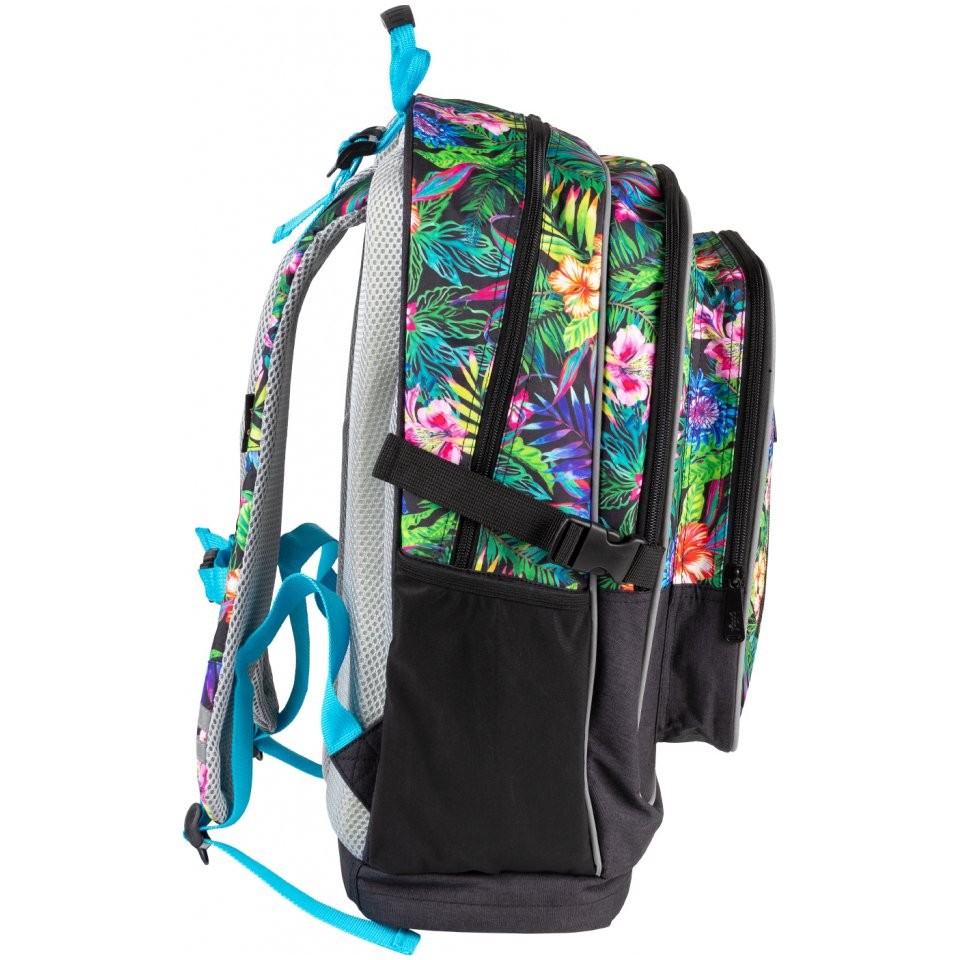 Tříkomorový školní batoh pro dívky v pestrobarevném motivu vhodný jako druhý batoh (3.-5. třída ZŠ). Třídílný set tvoří batoh, sáček na cvičky a studentský penál.