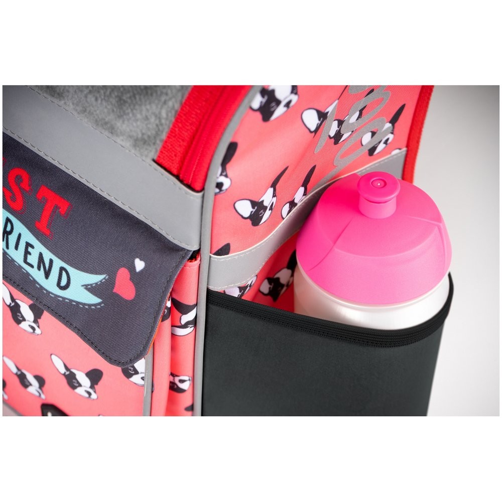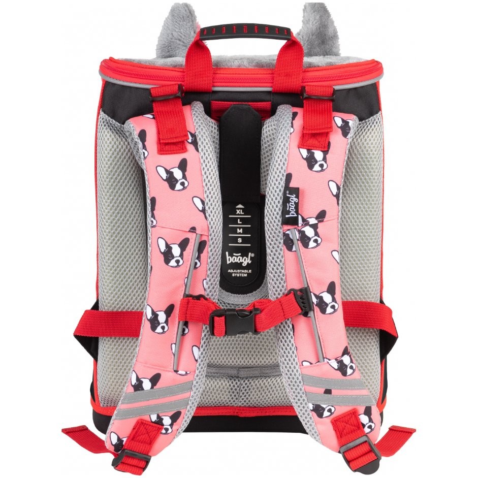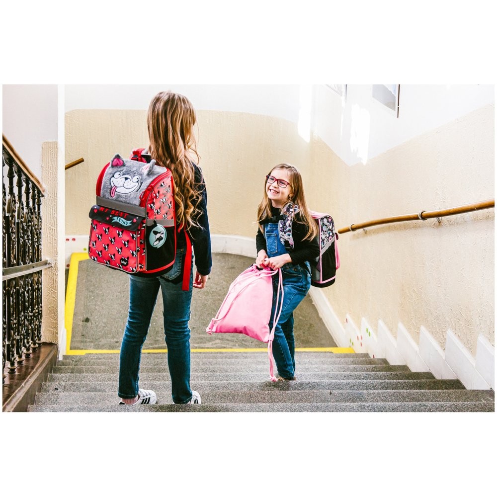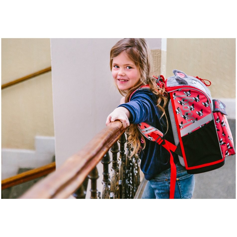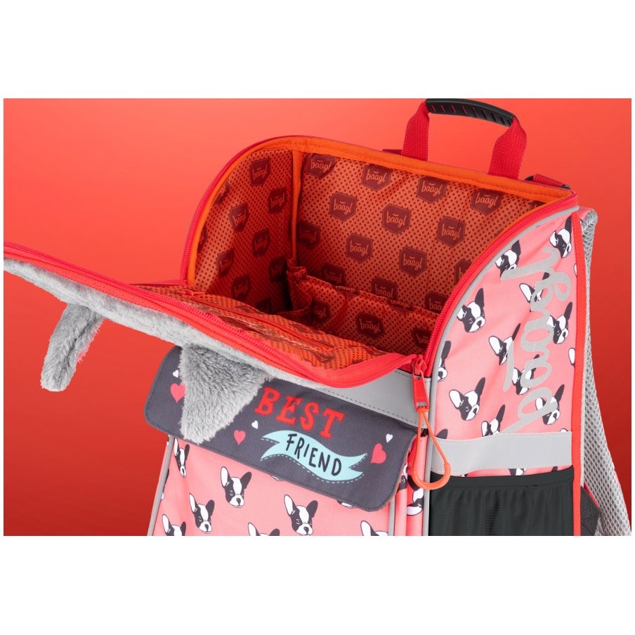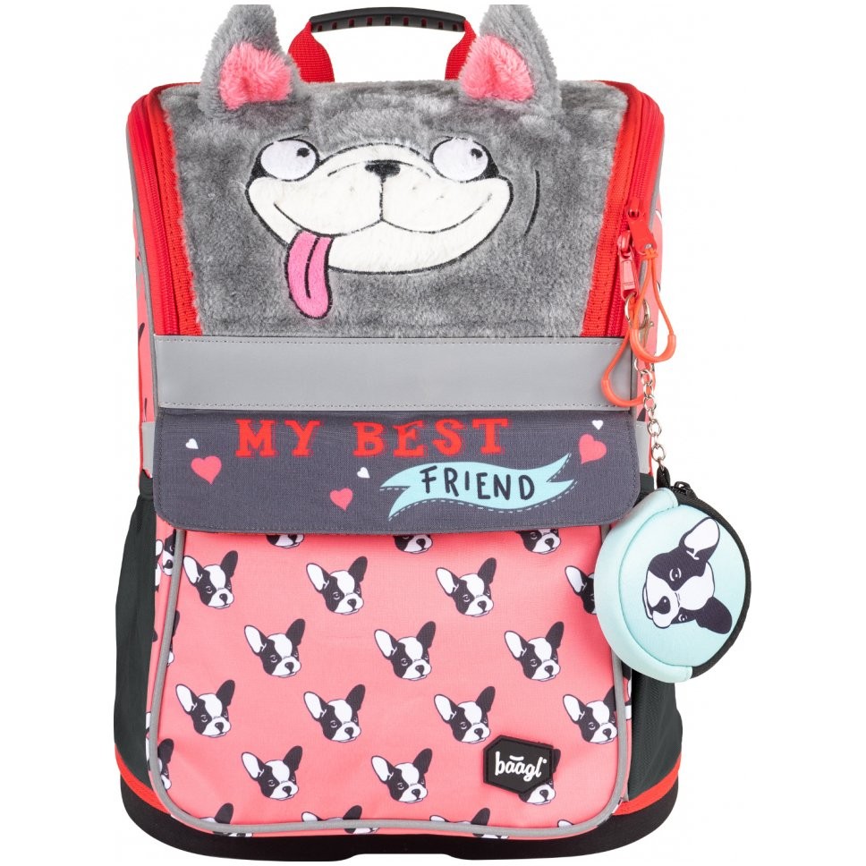 Školní aktovka Baagl Zippy Doggie s plyšovou klopou a obrázkem roztomilého pejska je vhodná pro dívky od 1. třídy ZŠ, doporučujeme ji průměrně vysokým až vyšším prvňáčkům. Třídílný školní set tvoří taška, penál a sáček na cvičky.