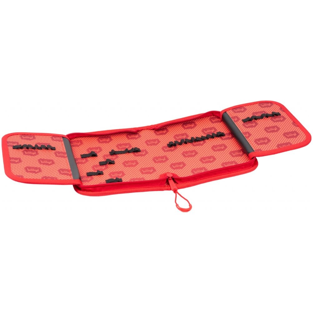 Jednopatrový školní penál se dvěmi klopami, prázdný. Obsahuje 25 gumových poutek pro úschovu psacích potřeb a 5 širších gumových poutek pro další školní potřeby (guma, ořezávátko, pravítko). Na rubu klopy průhledná folie pro založení rozvrhu hodin.