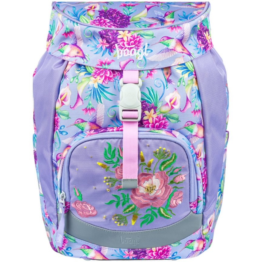 Lehký batoh Airys květinami, vhodný pro výšku postavy 115 – 130 cm. Batoh má jednu komoru a dno pouze mírně zpevněné, proto nestojí plný ani prázdný. Je vhodný všude tam, kde děti do školy nosí pouze málo školních potřeb. Na zádech dobře sedí. Před uzavřením klopou se hlavní kmora stahne zdrahovadlem.