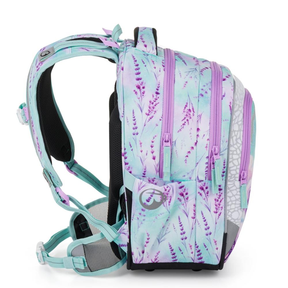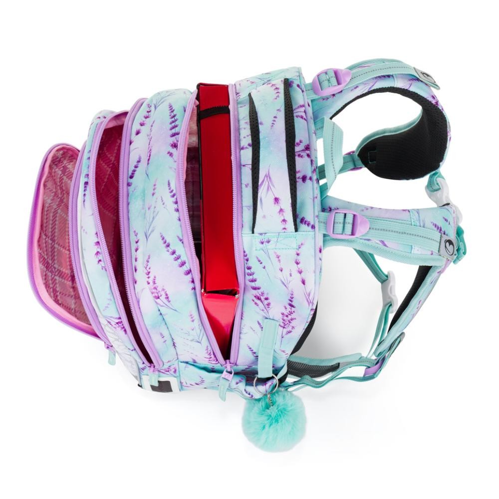 Ideální od 1. do 3. třídy. Má tři prostorné komory. Do hlavní se vejdou velké školní desky i učebnice a sešity formátu A4. V hlavní komoře je kompresní kapsa s elastickými postranními pásy na desky A4 a na velké učebnice. Pomáhá přitáhnout a udržet těžké pomůcky co nejvíce u zad, díky tomu má školák či školačka těžiště blízko páteře a při chůzi se nehrbí. Prostřední kapsa je připravená na penál a svačinu. V přední kapse je praktický organizér na mobil, tužky, sluchátka a peněženku. Na černou přezku v přední kapse můžete školačce připnout síťovaný sáček. Na bočních stranách jsou kapsy vhodné na láhev s pitím nebo třeba deštník.