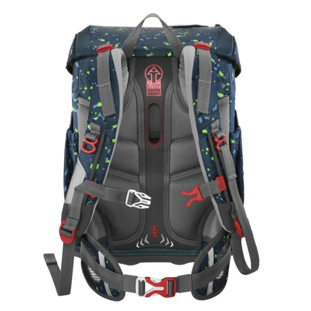 Odlehčený, odolný a voděodolný materiál, přehledná jednokomorová aktovka, lehká konstrukce ze sklolaminátu drží stabilní tvar aktovky. Ergonomicky tvarovaná záda s měkkým prodyšným polstrováním. Polstrované, nastavitelné popruhy na ramena ve tvaru S. Háčky na popruhu pro zavěšení konců popruhu, dotahovací pásky na ramenním popruhu, slouží k dokonalému přilnutí aktovky k zádům dítěte.