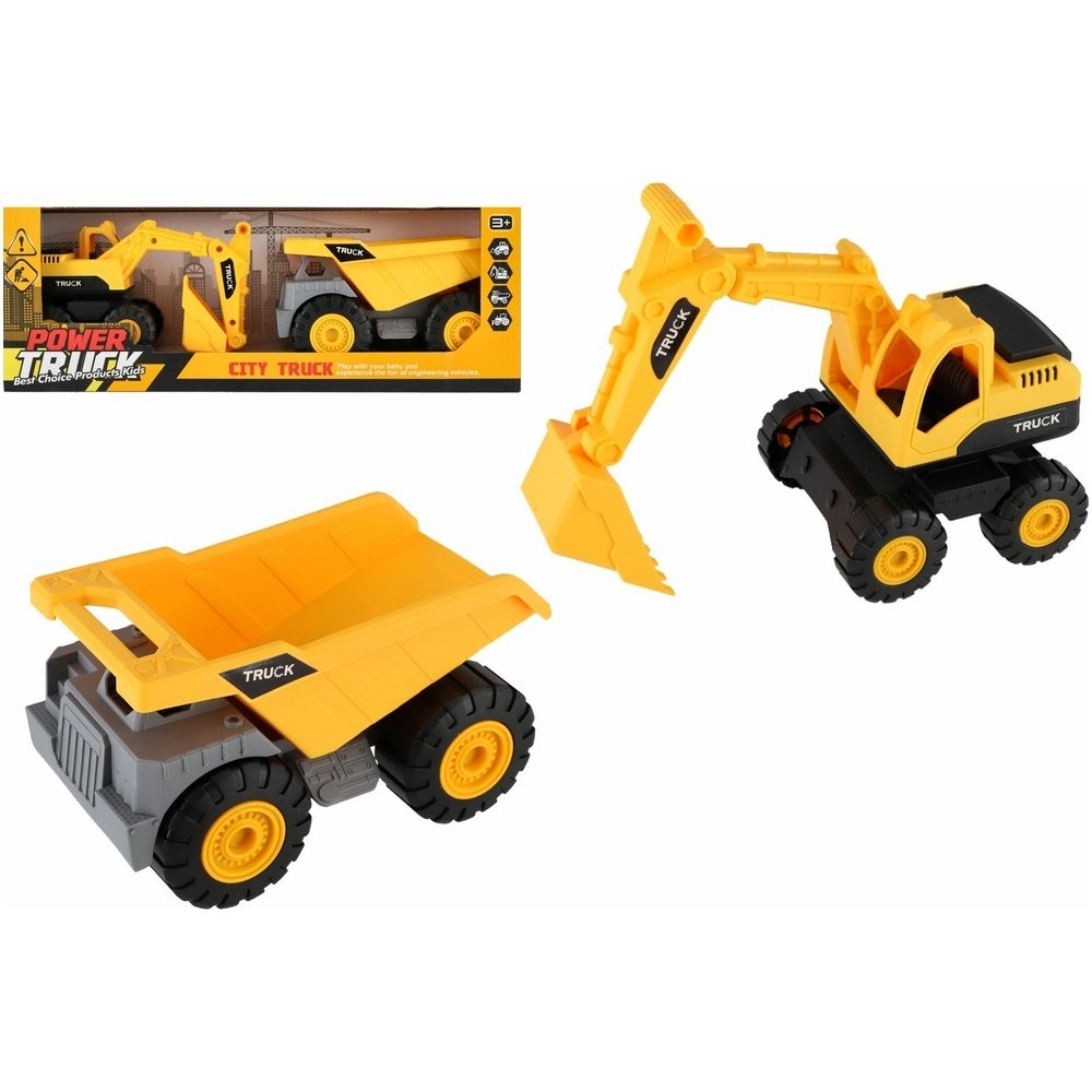 Tato sada dvou stavebních vozidel je skvělým doplňkem do každé dětské sbírky pracovních strojů. Bagr pro děti a nákladní auto jsou vyrobena z odolného plastu a mají volný chod, takže se snadno pohybují po jakémkoli povrchu – stačí je postrčit a jedou.
