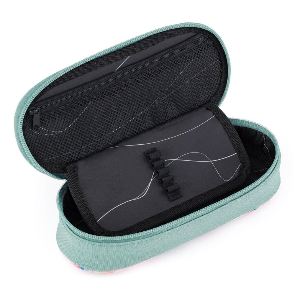 Oválný penál pro všechny starší školáky a studenty. Uvnitř pouzdra je síťová kapsička na zip a klopa. Na ní jsou umístěny gumičky pro uchycení celkem devíti tužek a propisek, které je potřeba mít přehledně uspořádané a po ruce. Volný prostor pod klopou slouží pro další psací potřeby – pastelky, fixy, ale i pravítko nebo kružítko.
