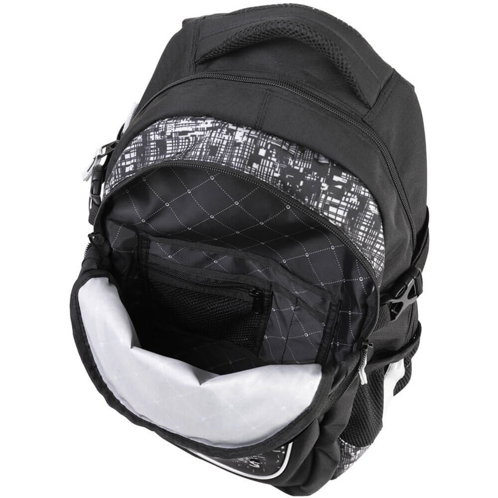 Hlavní komora batohu je nejprostornější a obsahuje oddělenou kapsu na tablet nebo notebook. Je navíc opatřena kompresními pásky k jednoduchému a rychlému nastavení hloubky. Při jejím plném zatížení upravuje ideální rozložení váhy na zádech dítěte. Prostřední kapsa obsahuje praktický organizér na drobnosti, přední kapsa je bez vnitřního členění. Boční síťované kapsy jsou určeny k uložení láhve na pití.