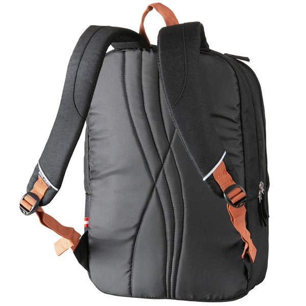 Velká zadní komora je členěna polstrovanou kapsou na tablet nebo laptop do velikosti 15“. Druhá komora je jednoduchá bez vnitřního členění. Uvnitř přední kapsy je bohatě členěný organizér s vnitřní kapsou na zip. Organizér tvoří kapsička na mobil, síťovaná kapsička na zip a přihrádky na psací potřeby. Obě komory se uzavírají zipem. Batoh je opatřen reflexními paspulemi ze všech stran pro lepší viditelnost. Záda batohu mají polstrování pro pohodlné nošení s ozdobným prošitím. Na přenášení batohu v rukách slouží pevné madlo. Po obou stranách jsou rozšiřitelné boční kapsy. Dno je vyztužené, textilní.