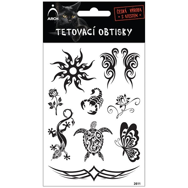 Tetování pro teenagery na kůži se symboly Slunce a zvířat v černé barvě. Dermatologicky testováno.