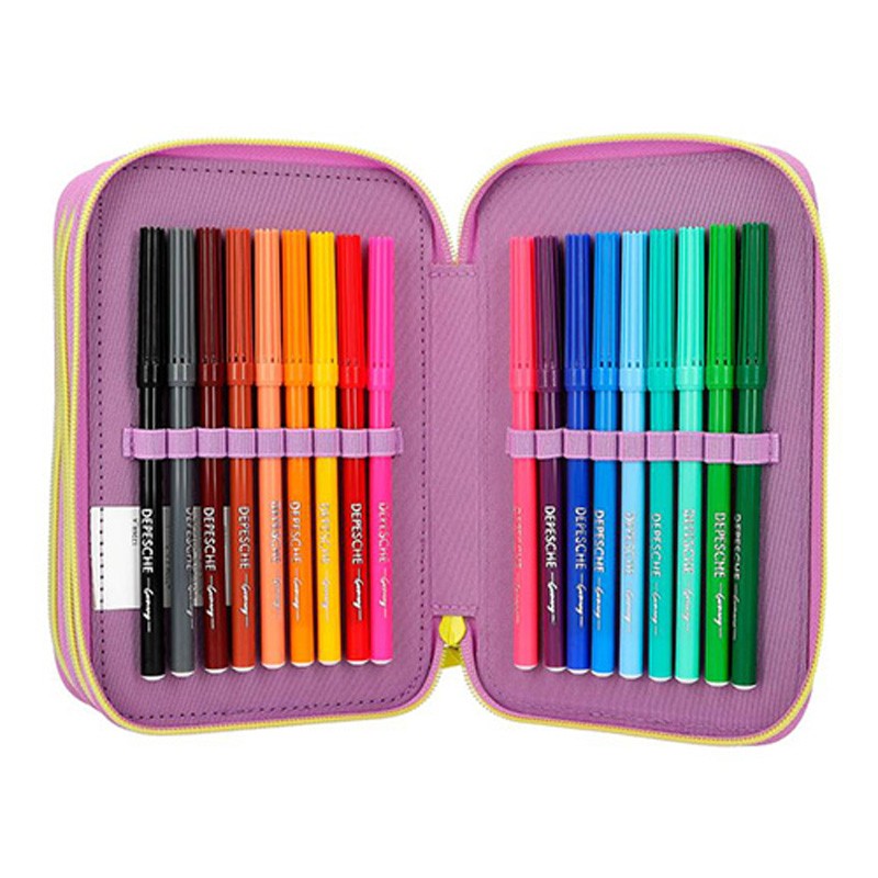 Penál obsahuje: 2 tužky, 18 pastelek, 18 fixů, nůžky, lepidlo, pravítko, ořezávátko, gumu a kapsičku.