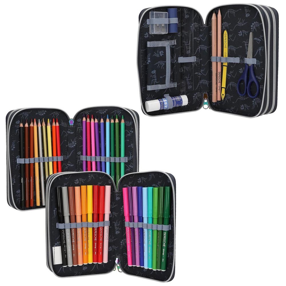 Nádherný třípatrový školní penál vyrobený z kvalitního materiálu odolného proti běžnému opotřebení. Skvěle promyšlená náplň penálu nabízí - 2 tužky, 18 pastelek, 18 fixů, nůžky, lepidlo, pravítko, malou kapsičku, ořezávátko i gumu. Penál s dinosaurem nabízí dostatečný vnitřní prostor postačující potřebám mladších i starších školáků.