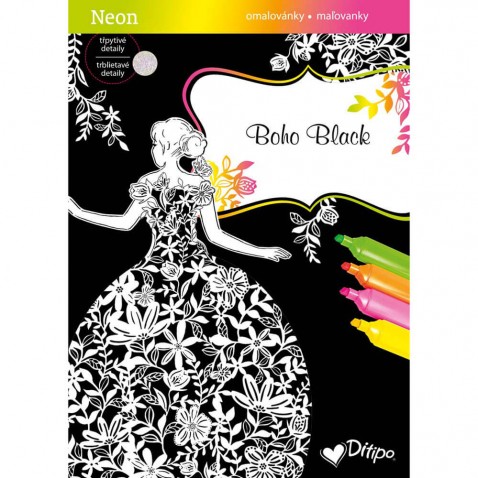 Krajky jsou poseté třpytkami a na černém pozadí. Skvělý efekt při použití zvýrazňovačů. Pevný papír pro různé techniky vybarvení, s klopou pro pohodlnější malování a perforací listů pro snadné odtržení. Zvýrazňovače nejsou součástí balení.