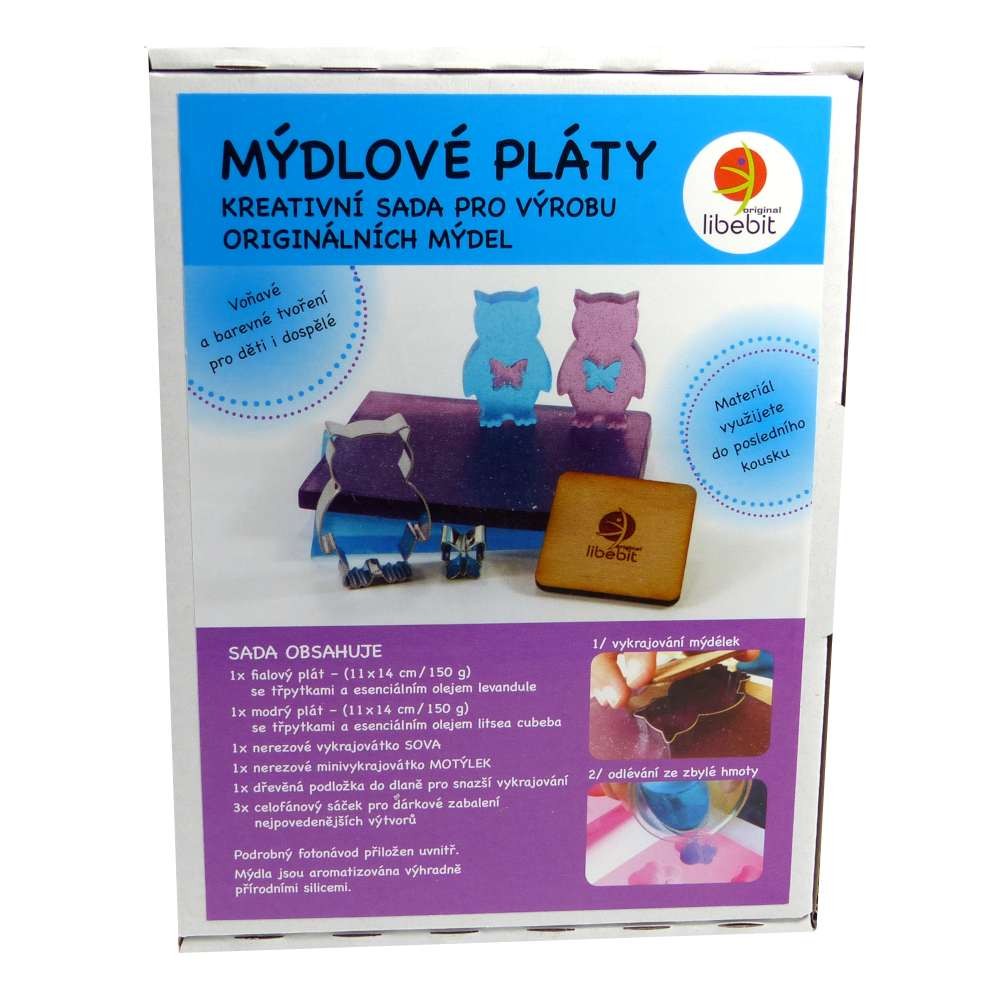 - 2 malé (11x14 cm, 150 g) mýdlové pláty na vykrajování mýdélek: modrý se třpytkami a esenciálním olejem litsea cubeba fialový se třpytkami a esenciálním olejem levandule
