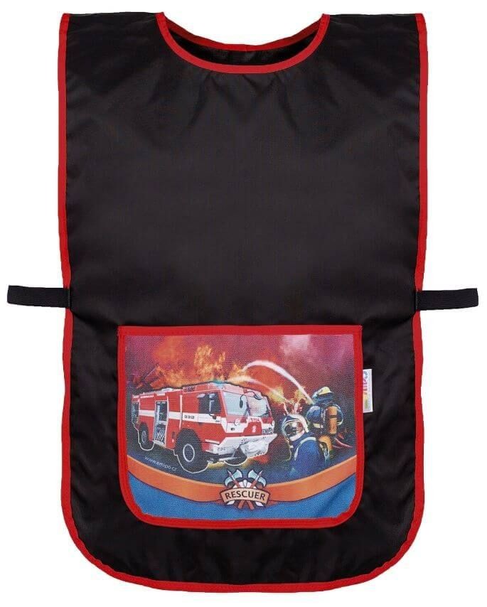 Chlapecká zástěrka do výtvarné výchovy je určená pro žáky 1. stupně. Obléká se přes hlavu, na bocích jsou díly spojeny širokou gumou. Na přední straně má velkou kapsu s motivem hasičů. Zástěrku doporučujeme prát v ruce nebo nečistoty setřít vlhkým hadříkem.