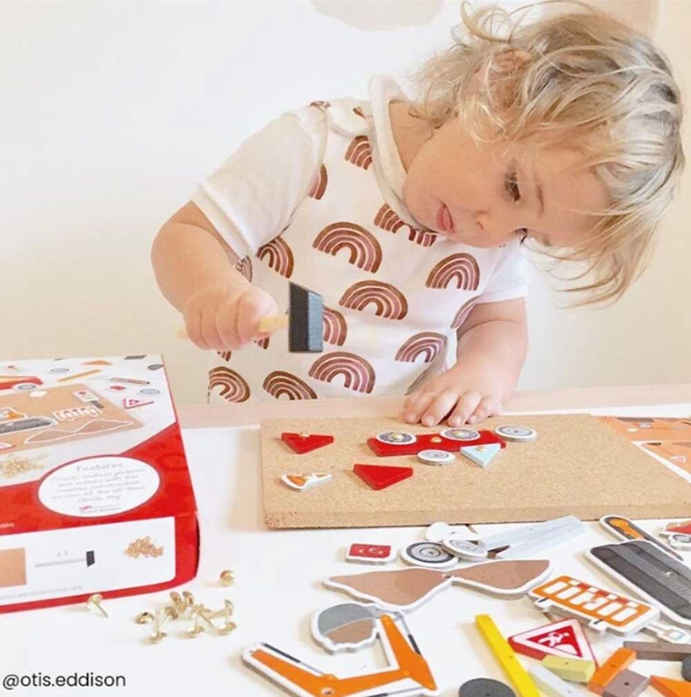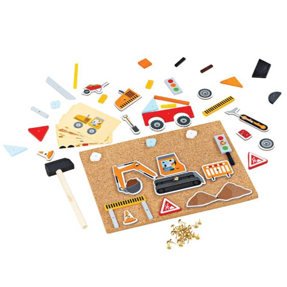 Kreativní sada - připínací desky, oblíbené mezi generacemi, nikdy nevyjdou z módy. Pestrobarevné dřevěné tvary lze kombinovat nejen dle přiložených předloh, přiloženým kladivem připínat na korkovou desku pomocí lesklých připínáčků (součástí balení), a vytvářet tak nekonečné množství různých stavebních scén.