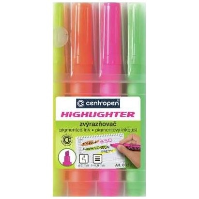 Zvýrazňovač Centropen 8552 - velkokapacitní zvýrazňovač s fluorescenčním inkoustem. Klínový hrot, na všechny druhy papírů. Šíře stopy 1-4,6mm. Sada 4 barev.